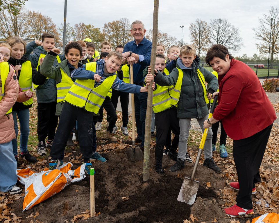 Op alle drie de locaties hielpen ook de wethouders mee. Sheila Schuijffel, Ad de Jong, Sjors Slaats en Timon Klerx verwelkomden de leerlingen en plantten samen bomen. Wethouder Sheila Schuijffel van duurzaamheid ging met leerlingen in gesprek over het belang van bomen: “Geweldig om te zien hoe enthousiast jullie vandaag aan de slag gaan. Bomen zijn niet alleen mooi, maar ook enorm belangrijk. Ze geven ons frisse lucht, zorgen voor schaduw en zijn een thuis voor vogels, bijen en andere dieren. Alles in de natuur heeft elkaar nodig. En vandaag helpen jullie daar zelf aan mee. Een groot dankjewel ook aan alle vrijwilligers die vandaag hebben geholpen. Zonder jullie inzet was dit niet mogelijk geweest.”