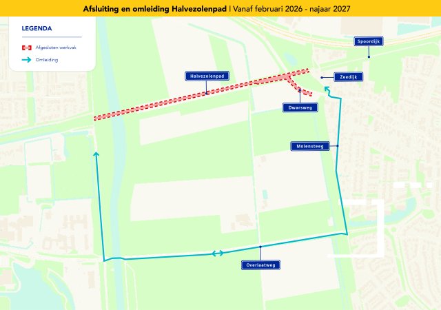 Vanaf maandag 2 februari is het Halvezolenpad deels afgesloten. Dit is nodig om veilig te kunnen werken aan de aanleg van een nieuwe fietsroute en een nieuwe fietsbrug. De werkzaamheden duren tot in 2027.