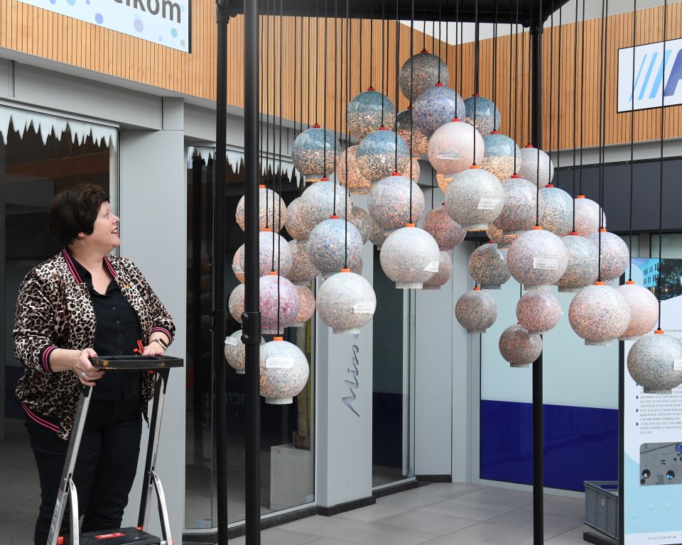 De kroonluchter werd in oktober 2022 voor het eerst onthuld. Een prachtig kunstwerk dat bestaat uit versnipperde petflesjes. De blikvanger werd gemaakt door honderden enthousiastelingen van verenigingen, scholen en organisaties uit onze gemeente. De kroonluchter laat zien dat afval waardevol is. En dat je van plastic afval weer iets moois kan maken. Het lelijke eendje wordt een prachtige zwaan.