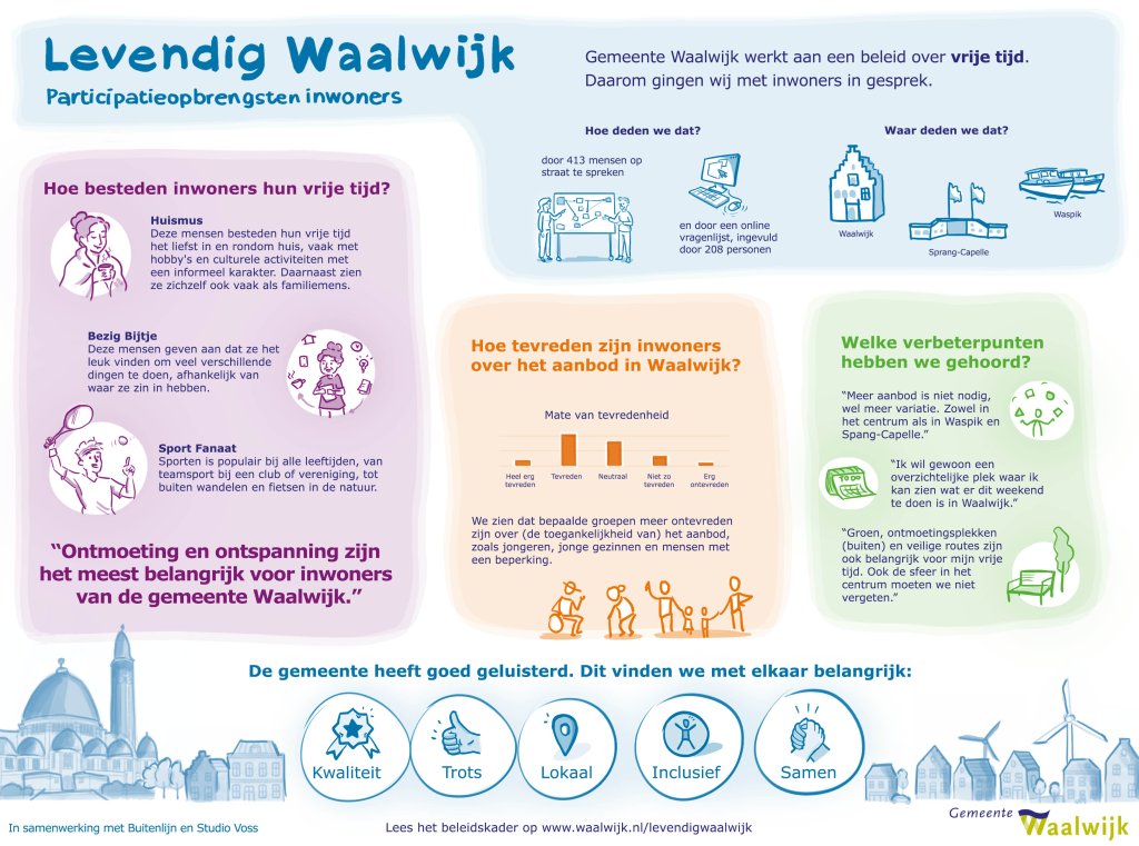 Dit beleidskader is tot stand gekomen in nauwe samenwerking met inwoners, verenigingen, ondernemers en partners. Uit de gesprekken met inwoners kregen we een breed beeld van hoe mensen hun vrije tijd beleven en besteden, wat ze belangrijk vinden en welke mogelijkheden zij zien om Waalwijk levendiger te maken. Met partners uit sport, cultuur, erfgoed, toerisme, recreatie en horeca gingen we vervolgens verdiepende gesprekken aan en keken we naar kansen, knelpunten en rollen binnen het vrijetijdsdomein.