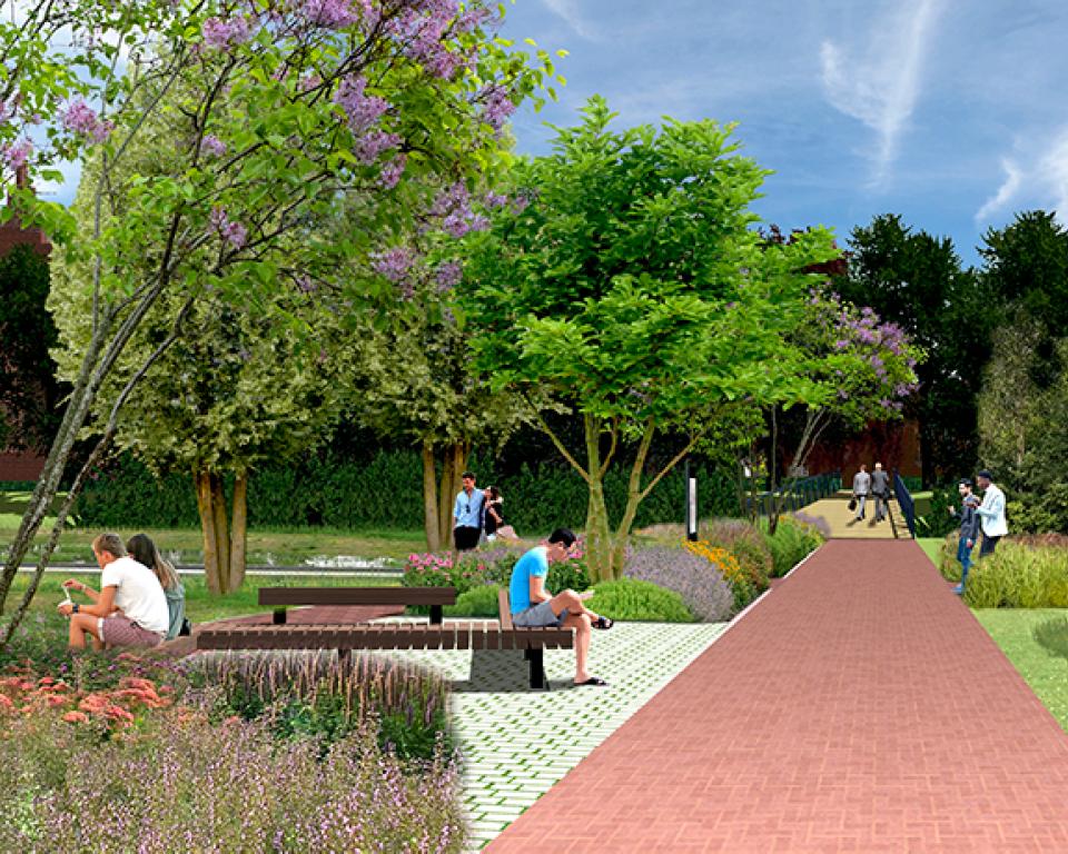 De wadi’s zaaien we in met ruiger gras en we planten er verschillende soorten bomen. Op een verhoogd pad loop je hier langs als je naar het stadhuis loopt.