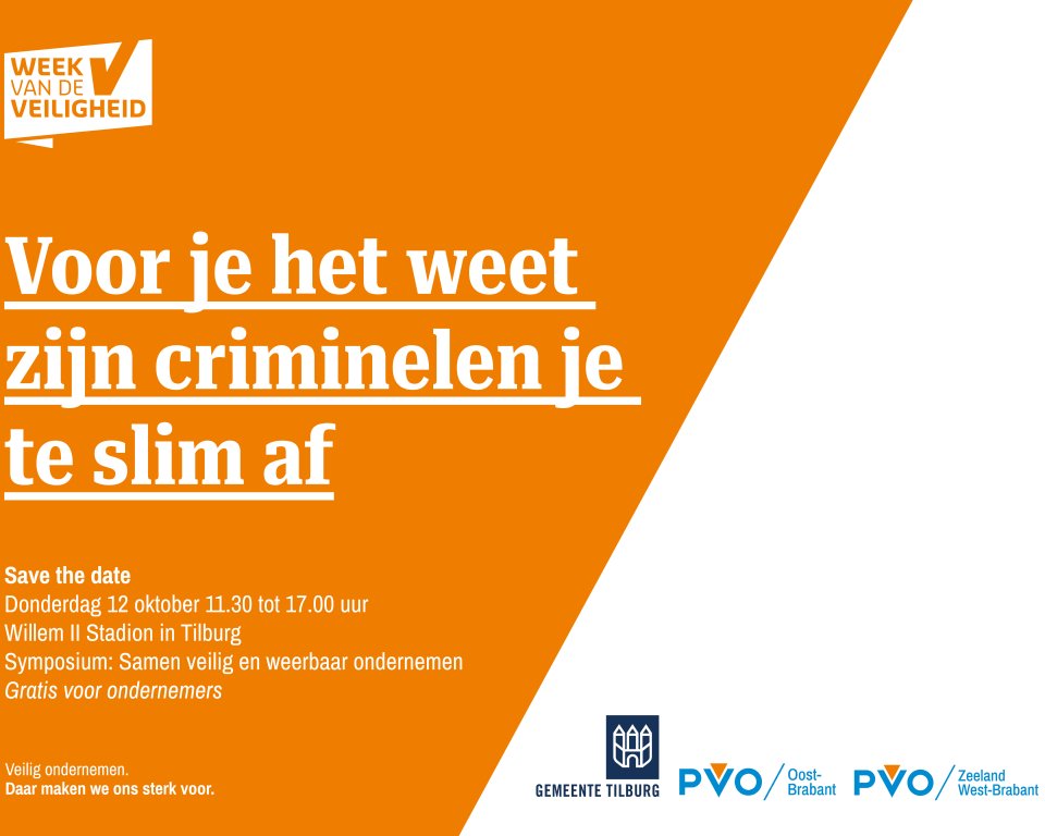 Het symposium Samen veilig en weerbaar ondernemen vindt plaats op donderdag 12 oktober (11.30 uur – 17.00 uur) in het Koning Willem II stadion en is voor ondernemers uit de regio gratis te bezoeken. Wil je zeker zijn van een plekje? Zet het nu alvast in je agenda en stuur een e-mail naar veiligondernemen@tilburg.nl. Geef hierin aan van welk bedrijf je bent en het aantal personen waarmee je het symposium wil bezoeken (max. 3 personen per bedrijf).